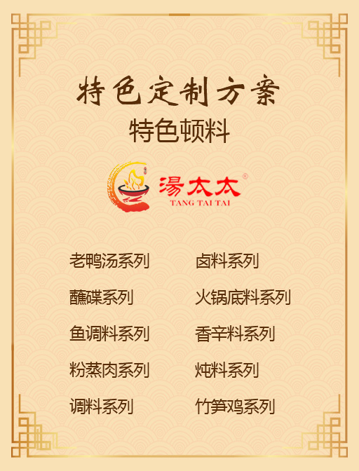重庆汤太太提供各色顿料,这里你可以找到属于自己的口味、产品、服务,我们根据不同的客户我们制定了一套方案,根据客户需求可定制产品的大小分量以及特殊要求,只有你想不到,没有我们做不到。